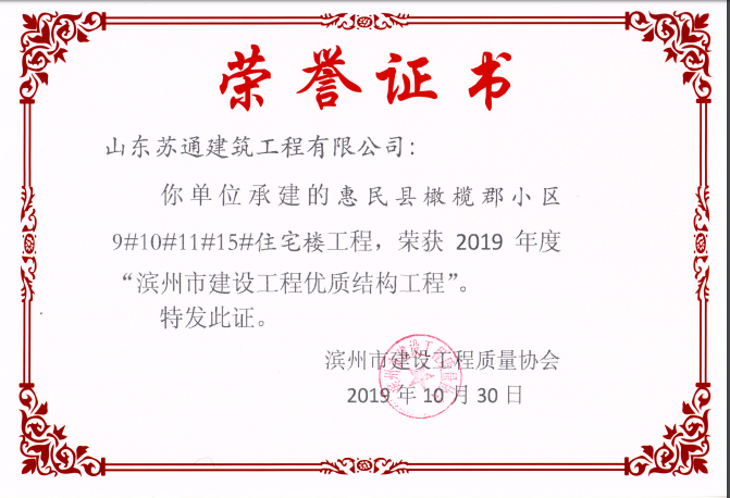 山東蘇通建筑工程有限公司,創建于2009年8月。目前擁有房屋建筑工程施工總承包壹級、市政公用工程施工總承包叁級、水利水電工程施工總承包叁級資質,同時還具有建筑裝修裝飾工程專業承包貳級、消防設施工程專業承包貳級、鋼結構工程專業承包叁級、建筑機電安裝工程專業承包叁級等專業承包資質。 公司總部坐落于山東省濱州市濱城區黃河十二路877號,現有辦公面積約2000平方米,機構設黨支部工會辦公室、總經理辦公室、綜合辦公室、工程管理部、經營預算部、資產財務部、材料設備部、運行管理部、法律事務部等多個職能部門。公司管理體系已經通過了GB/T 19001及GB/T 50430質量管理體系、GB/T 24001環境管理體系(EMS)、GB/T 28001職業健康安全管理體系(OHSMS)等體系的認證。 公司承建完工了濱州市建大教師之家、建大清怡苑、香格里拉水岸綠城住宅小區、雙泰建大城、曲阜崇德公館住宅小區、北海新區御景藍灣住宅小區、沾化德榮國際華城住宅小區、惠民橄欖郡住宅小區等工程項目,目前在建工程項目有:濱州市頤高國際電子商務產業園住宅小區項目、濱州市東盛國際項目、高新區建大中央華府住宅小區項目、濱州市融匯新里程住宅小區項目、濱州市建大秦皇壹號住宅小區項目、濱州市森林花...